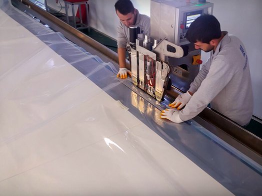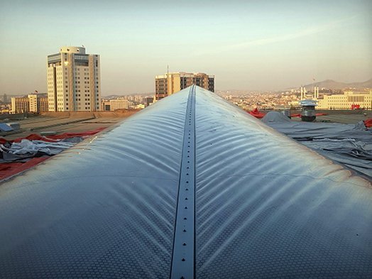 Chaque coussin est fixé sur un cadre lui même fixé sur la charpente métallique tout en maintenant l’étanchéité. La légèreté de ces coussins permet de réaliser des ouvrages à grandes portées. La forme des coussins est libre. Ces éléments autorisent beaucoup d’audace architecturale.