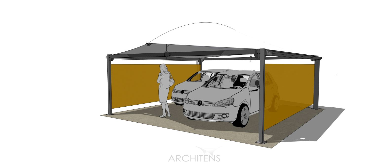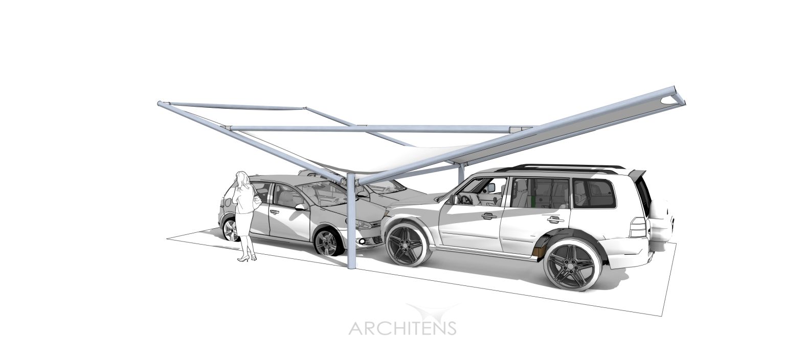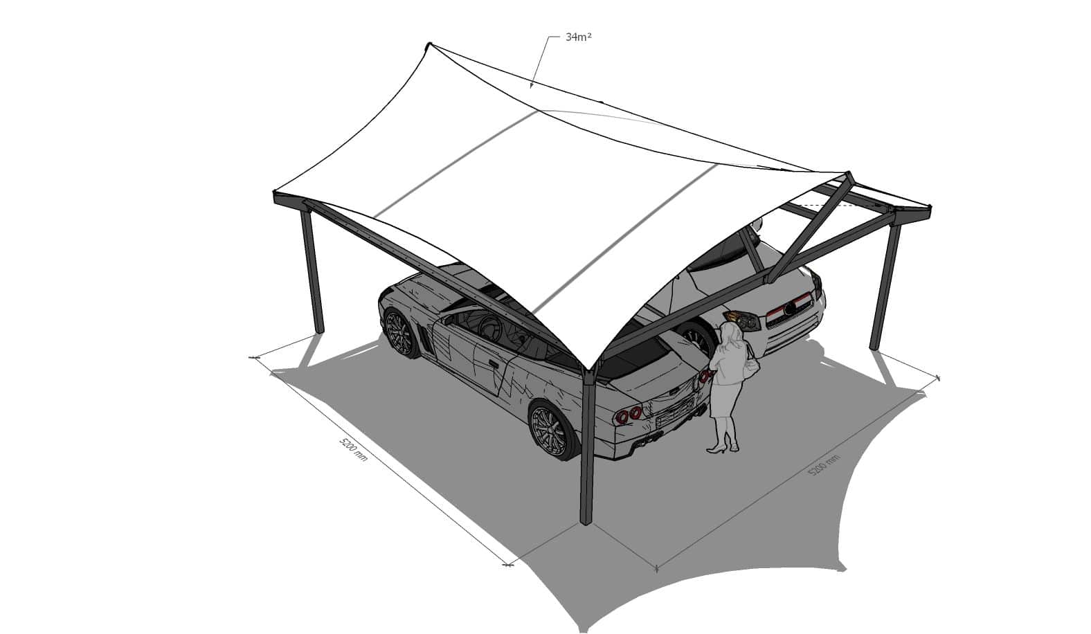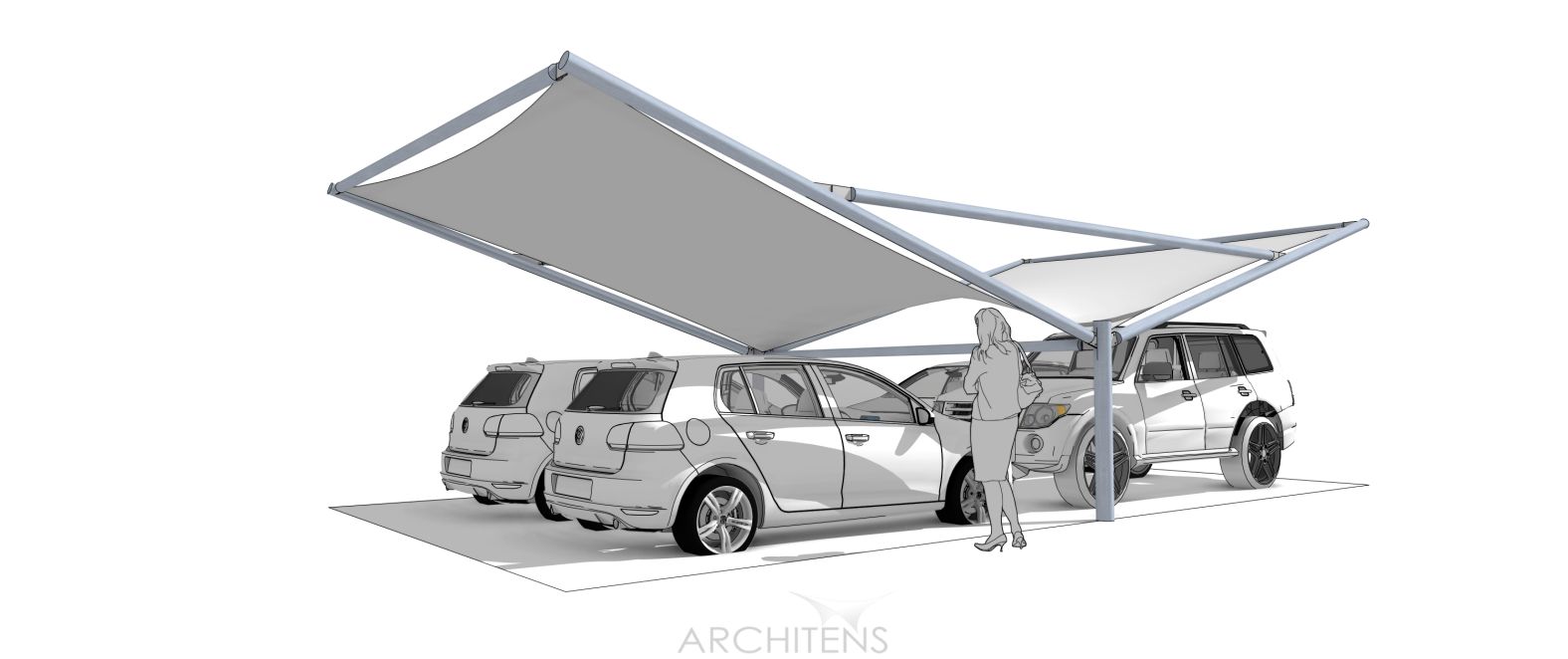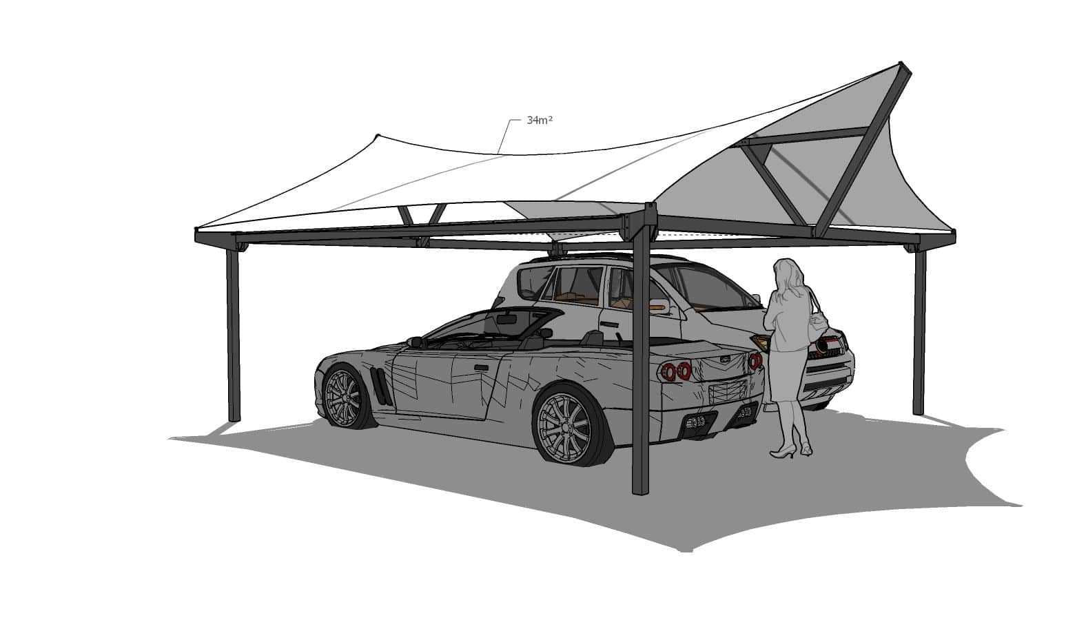 La membrane textile tendue, portée par une structure fine en acier, assure une protection efficace contre le soleil, la pluie et la neige, tout en favorisant une ventilation naturelle. Sa géométrie contemporaine s’intègre harmonieusement dans les environnements résidentiels et valorise l’espace extérieur.