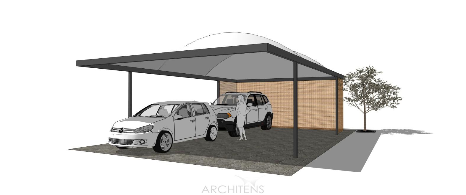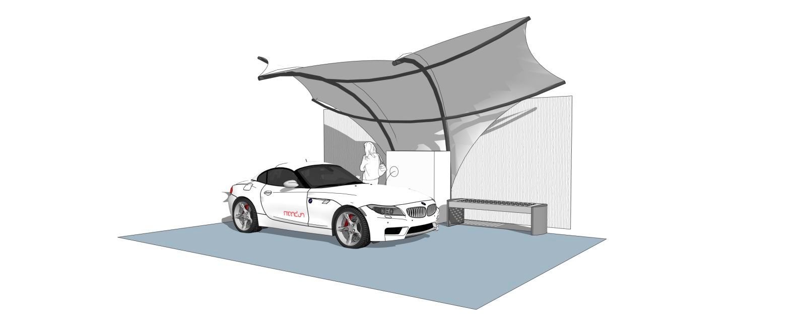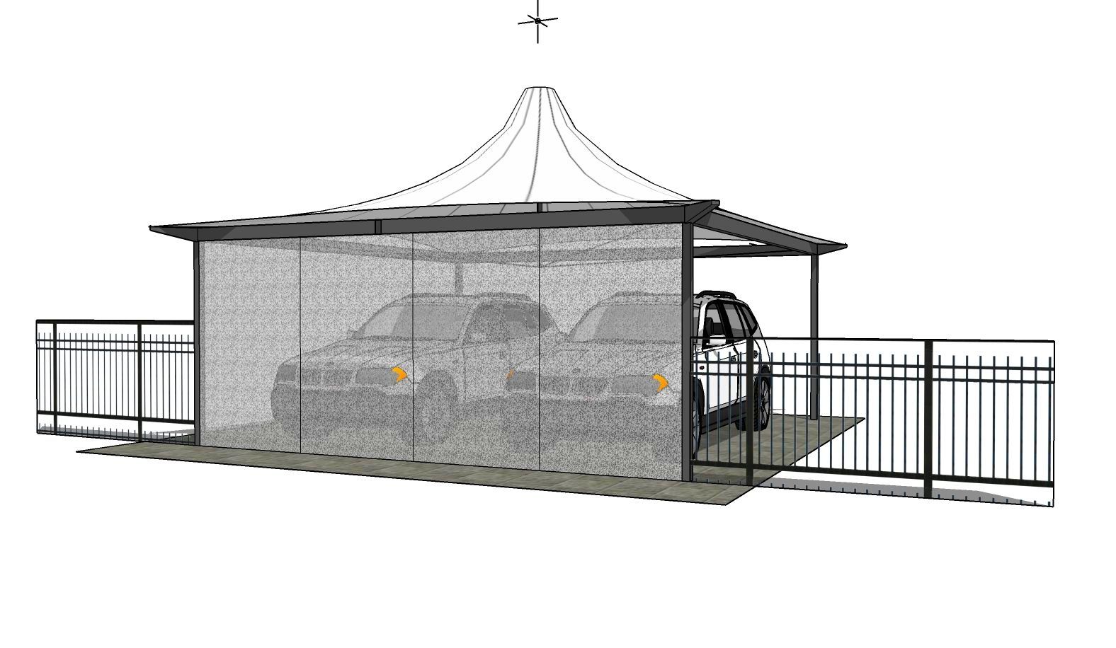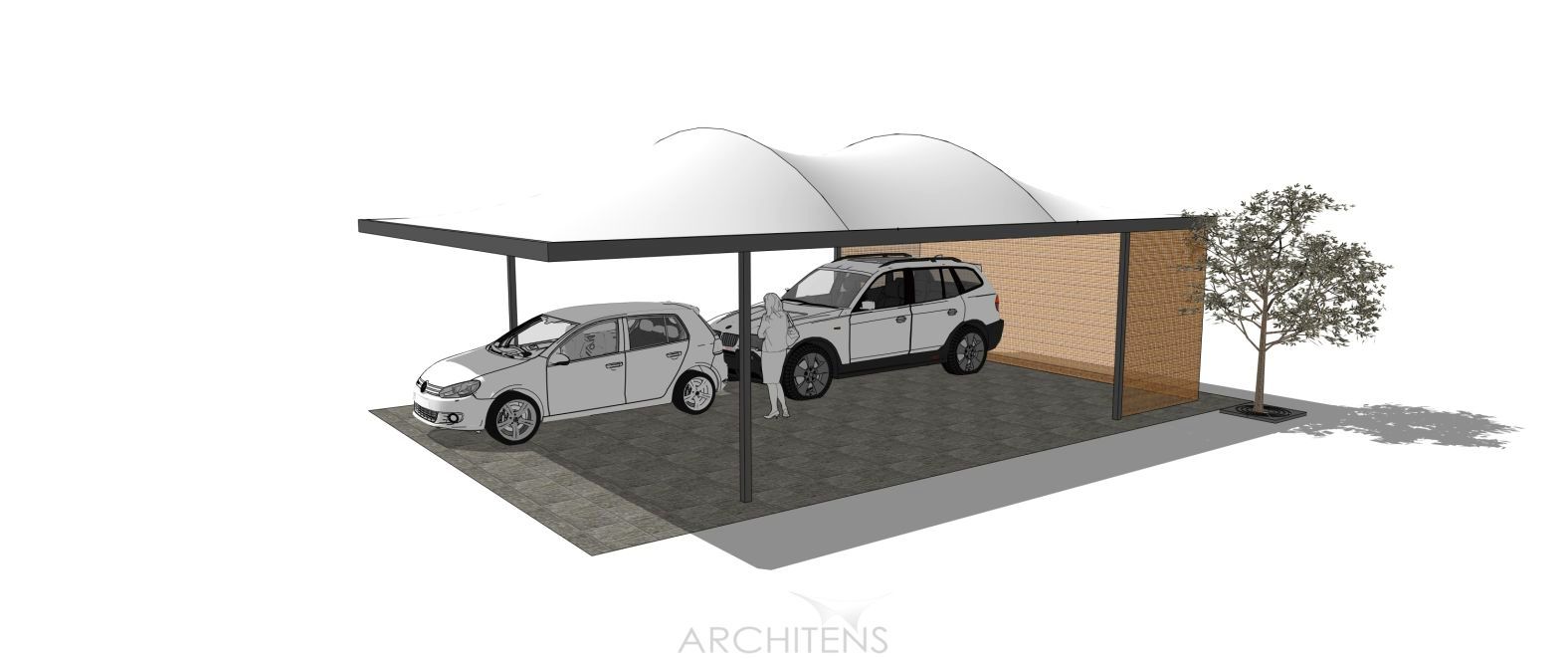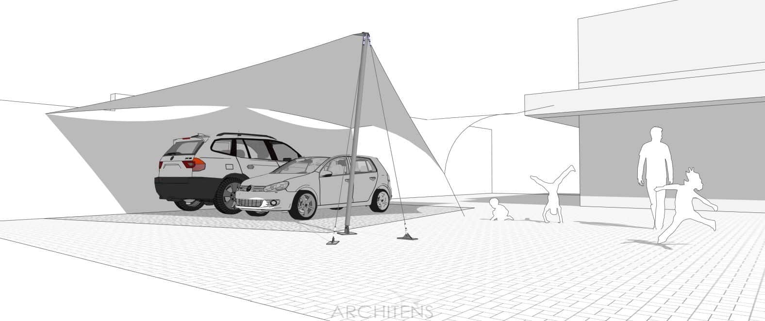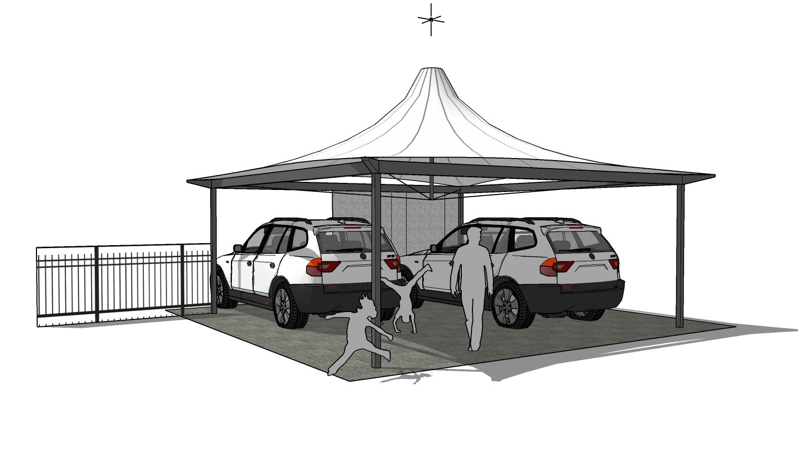 La membrane textile tendue, portée par une structure fine en acier, assure une protection efficace contre le soleil, la pluie et la neige, tout en favorisant une ventilation naturelle. Sa géométrie contemporaine s’intègre harmonieusement dans les environnements résidentiels et valorise l’espace extérieur.