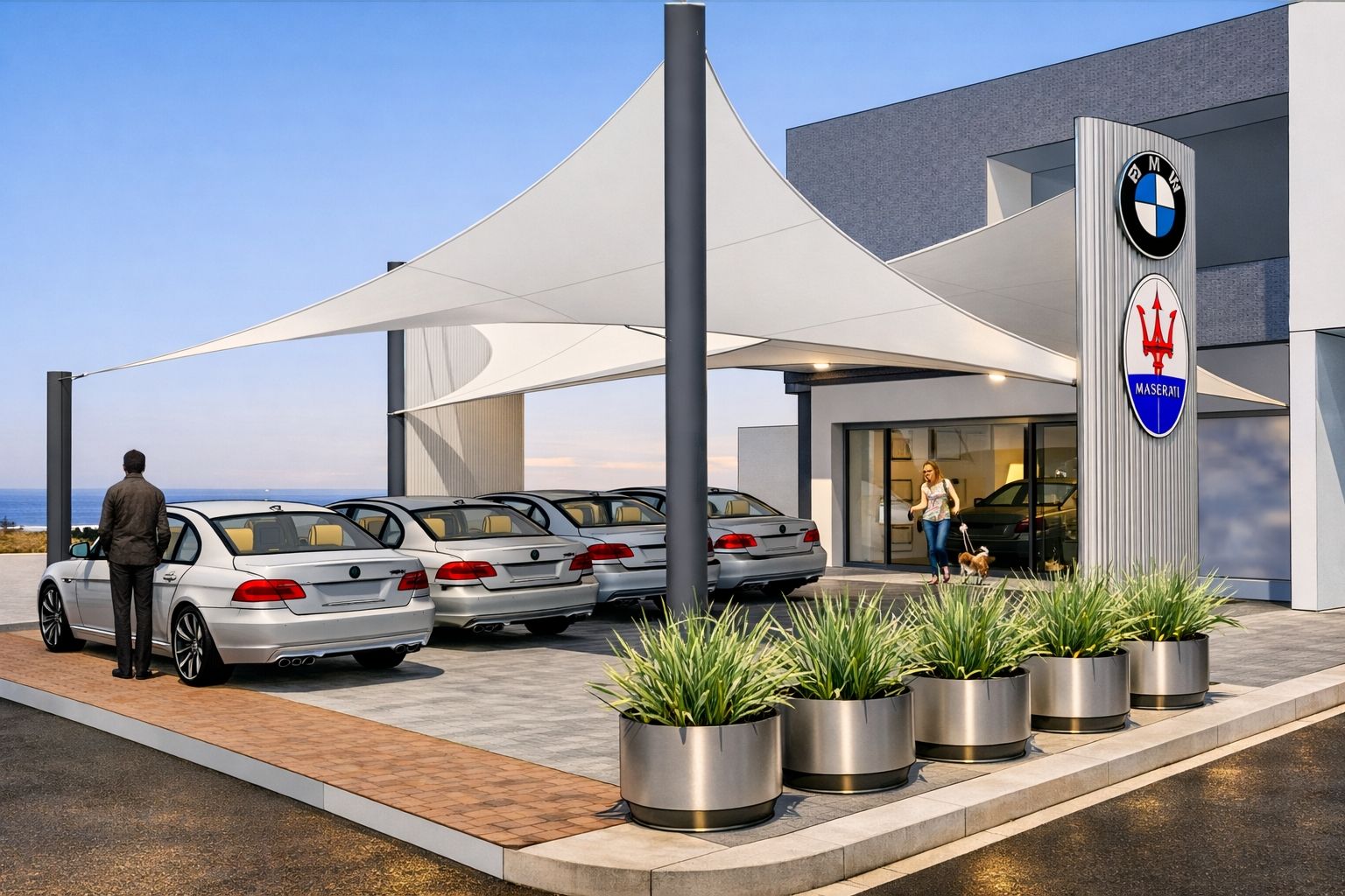 Les voiles tendues sont une solution particulièrement adaptée aux concessions automobiles et aux places d’exposition extérieures . Elles offrent une protection solaire efficace tout en valorisant l’image architecturale du site.